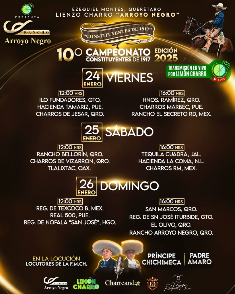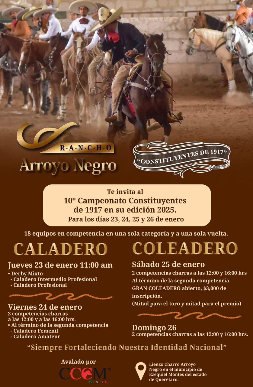 Ezequiel Montes, Querétaro – El emblemático Lienzo Charro de Arroyo Negro se prepara para recibir el Décimo Campeonato Constituyentes de 1917, un evento que promete convertirse en una gran celebración de las tradiciones charras en la región. Durante cuatro días, del 23 al 26 de enero, aficionados y participantes disfrutarán de emocionantes competencias que resaltarán lo mejor de la charrería mexicana.