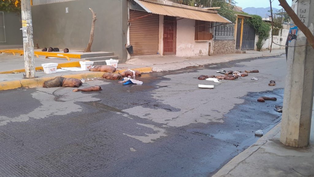 Al lugar arribaron elementos de la coordinación Renacimiento en Acapulco, Guerrero, quienes encontraron 3 hieleras las cuales contienen vísceras, 4 cartulinas y extremidades inferiores y superiores esparcidas sobre el pavimento, además de un vehículo tipo Urban calcinado en su totalidad.