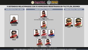 Mediante labores de inteligencia e investigación, elementos de la Secretaría de la Defensa Nacional (Defensa), Secretaría de Marina (Semar), Fiscalía General de la República (FGR), Guardia Nacional (GN) y Secretaría de Seguridad y Protección Ciudadana (SSPC), junto con la Fiscalía General de Justicia (FGJ) y la Secretaría de Seguridad (SS), ambas del Estado de México, detuvieron a 10 hombres y una mujer, vinculados con al menos 16 homicidios en el Estado de México.