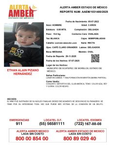 Elementos de la Célula de Búsqueda de Personas Desaparecidas de la policía municipal mantienen activo el protocolo de localización del menor Ethan, de tres años de edad, quien cuenta con Alerta Amber y se encuentra en proceso familiar de guarda y custodia entre los padres.