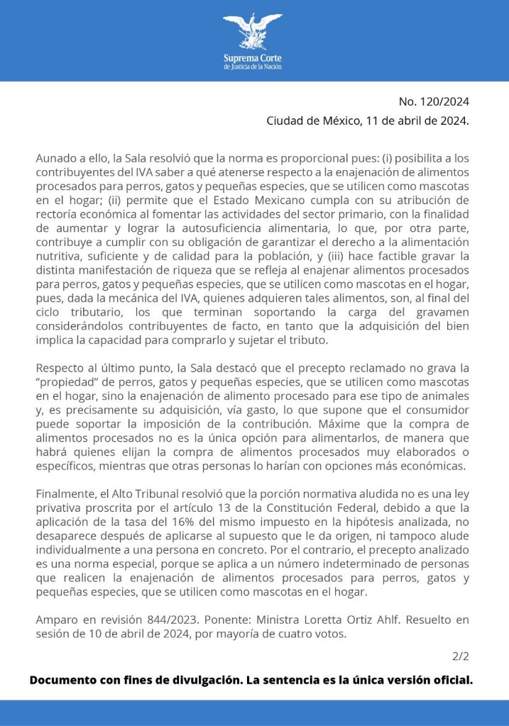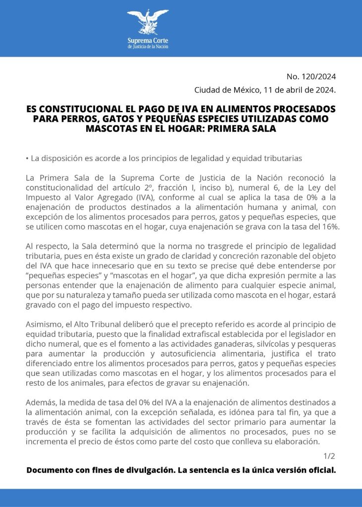 La Primera Sala del Tribunal del Poder Judicial de la Federación reconoció la constitucional del artículo 2do de la Ley del Impuesto al Valor Agregado para gravar con el 16% a los alimentos procesados para perros, gatos y pequeñas especies que se utilicen como mascotas en el hogar, para efectos de gravar su enajenación.