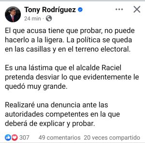 En su cuenta personal Tony Rodríguez desestimo los señalamientos de Raciel Pérez, informando que demandara al morenista para que pruebe sus acusaciones ante las instancias correspondientes.