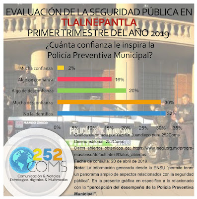Tlalnepantla de Baz a 1 de mayo del 2019.- El 62 por ciento de los vecinos del municipio de Tlalnepantla desconfían de su Policía municipal revela la Encuesta Nacional de Seguridad Pública Urbana, ENSU realizada por el Gobierno Federal durante el primer trimestre de administración del Alcalde, Raciel Pérez Cruz.