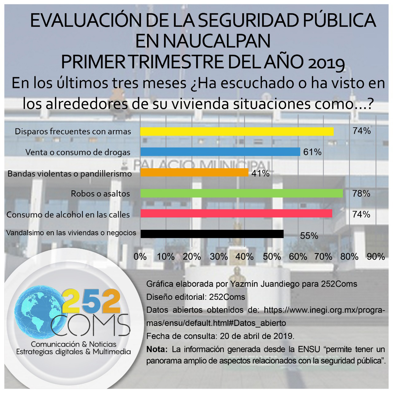 La Encuesta Nacional de Seguridad Pública Urbana (ENSU), realizada por el INEGI, precisó que ante el cuestionamiento “En los últimos tres meses ¿Ha escuchado o ha visto en los alrededores de su vivienda situaciones como?”: el 78 por ciento fue “Robos o Asaltos”, el 74 por ciento fue de “Disparos frecuentes con armas”.