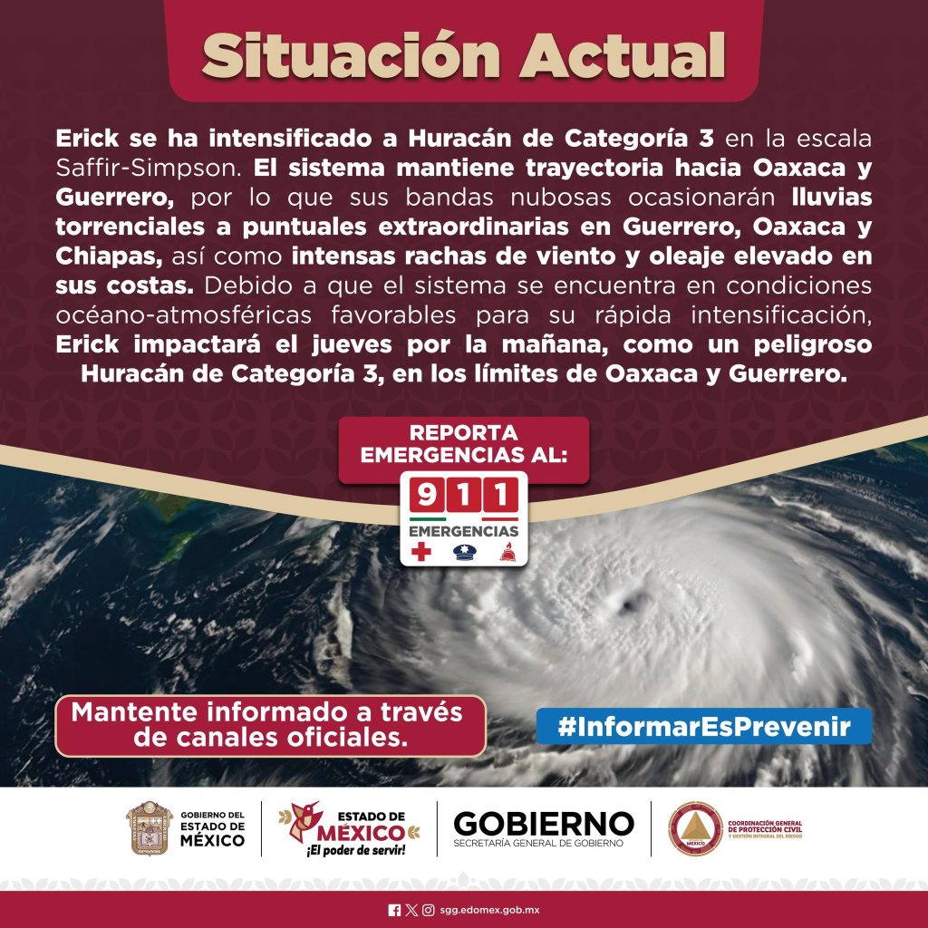 La llegada del huracán Erick a costas mexicanas también tendrá impacto prácticamente de los cuatro puntos cardinales del Estado de México. La coordinación de Protección Civil Estatal, informó una serie de medidas que deberán de tomarse ante este fenómeno hidrometeorológico.