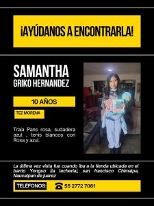 La niña Samantha Grico Ramírez de 10 años de edad fue reportada como desaparecida, y fue vista por última vez cuando iba a la tienda en el barrio Yongua del pueblo de San Francisco Chimalpa; de los hechos tuvo conocimiento la Policia Municipal de Naucalpan y la Secretaría de Seguridad y Protección Ciudadana del Estado de México.
