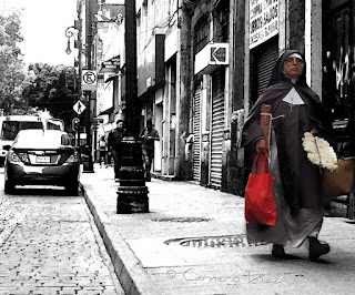 Magdalena camina en ese ambiente a paso firme sosteniendo en su mano izquierda un trapeador y en la otra una bolsa roja con enceres de limpieza; la religiosa atrae las pocas miradas, su hábito gris y blanco resaltan entre la calle.