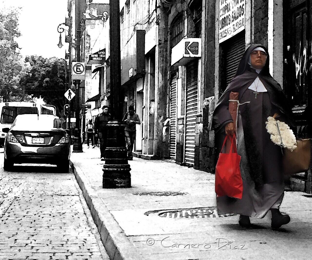 Magdalena camina en ese ambiente a paso firme sosteniendo en su mano izquierda un trapeador y en la otra una bolsa roja con enceres de limpieza; la religiosa atrae las pocas miradas, su hábito gris y blanco resaltan entre la calle.