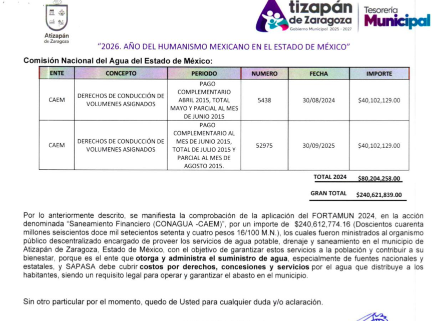 Por ello, sentencia el órgano fiscalizador, no es posible justificar el monto entregado por 240 millones 612 mil 774 pesos, por tanto el gobierno de Atizapán de Zaragoza, debe aclarar y proporcionar la documentación adicional justificativa y comprobatoria de ese monto, por concepto de la trazabilidad total del recurso de los pagos realizados a través del Sistema de Agua Potable, Alcantarillado y Saneamiento del Municipio de Atizapán de Zaragoza (SAPASA) y de la Secretaría de Finanzas del Estado de México cuyo destino se desconoce, correspondientes al saneamiento financiero de SAPASA (CONAGUA-CAEM).