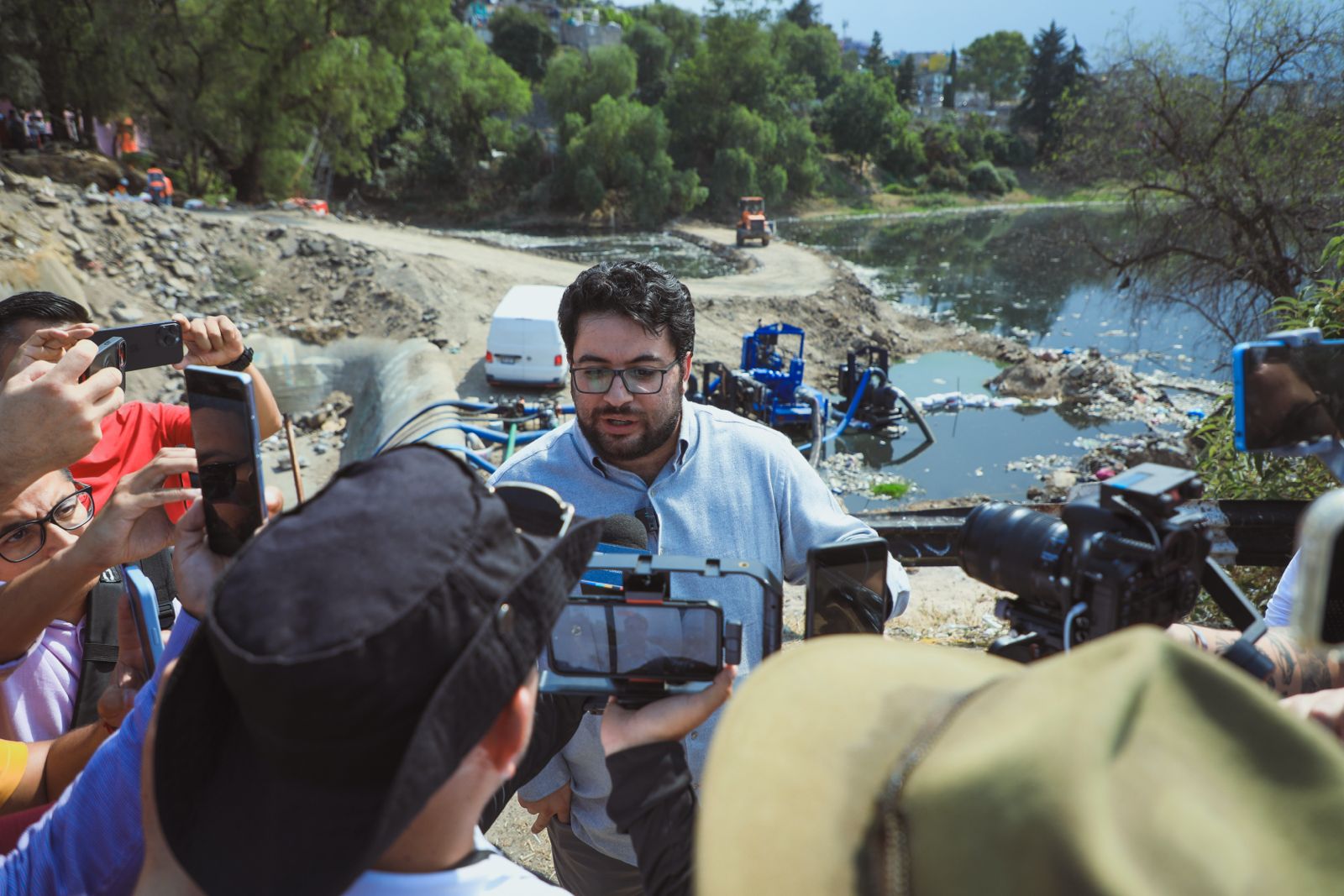 En conferencia de prensa y en presencia de vecinas y vecinos, destacó la coordinación entre el Organismo de Agua Municipal OAPAS con autoridades de la CAEM y CONAGUA, a través del Organismo de Cuenca Aguas del Valle de México (OCAVM), Citlalli Peraza Camacho, en el proceso para la liberación del tapón de basura, que ha avanzado en tiempo y forma.