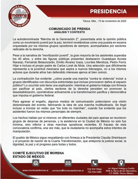 En un comunicado, el partido Morena en el Estado de México desestimó la marcha de la Generación Z, celebrada este sábado en el Zócalo de la Ciudad de México, a la que calificó como una “puesta en escena” orquestada por los opositores y por sectores radicales de la derecha.