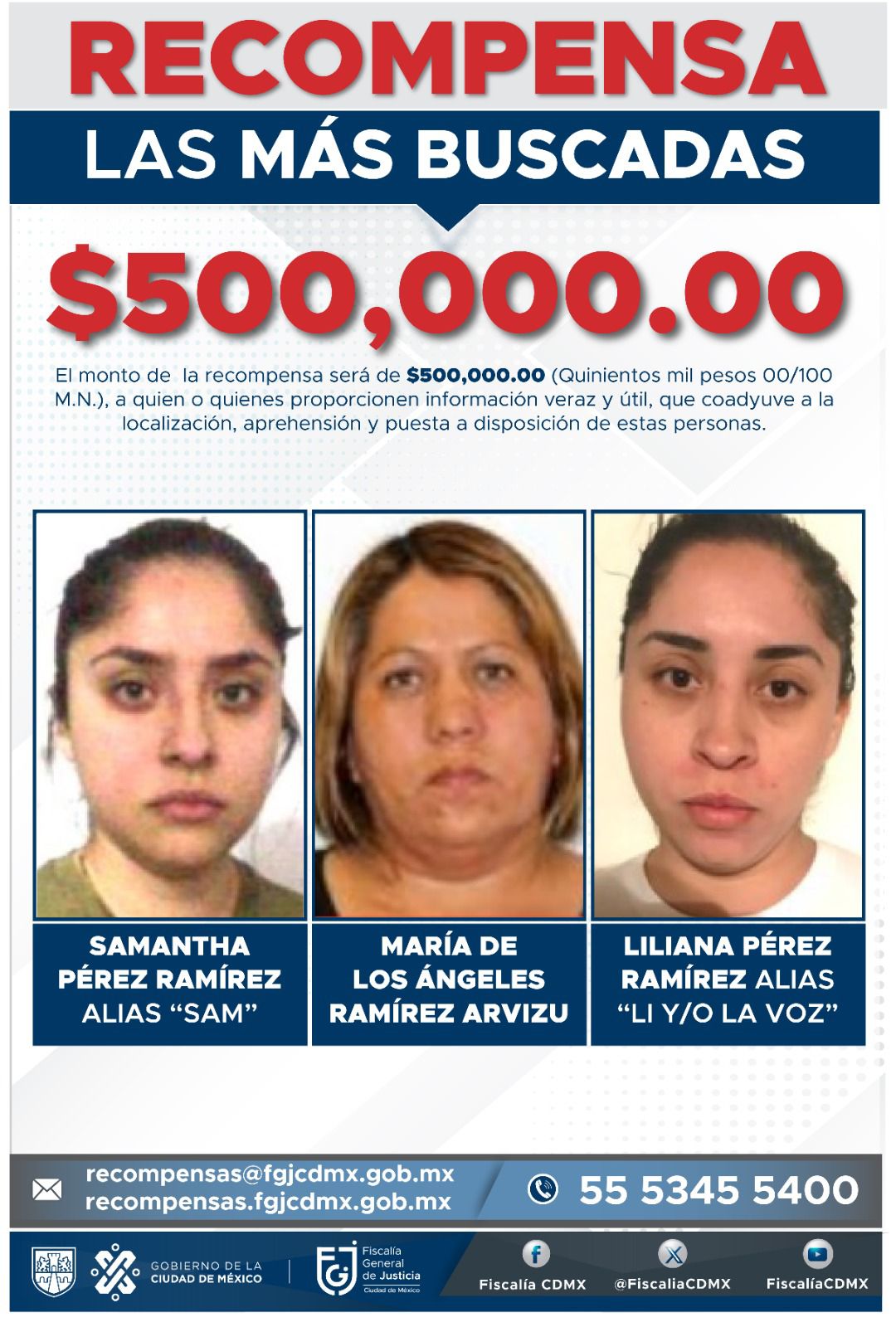 Por cada una de las tres mujeres, el monto de la recompensa será de 500 mil pesos, a quien o a quienes proporcionen información veraz y útil, que coadyuve a su localización, detención o aprehensión, se le entregará.