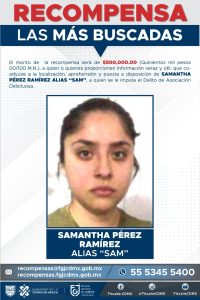 Samantha Pérez Ramírez, alias “Sam” cuenta con una orden de aprehensión y se encuentra posiblemente relacionada con una carpeta de investigación por el delito de asociación delictuosa.