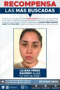 Liliana Pérez Ramírez, alias “Li” y/o “La Voz”, se encuentra posiblemente relacionada con una carpeta de investigación por el delito de asociación delictuosa y cuenta con una orden de aprehensión.