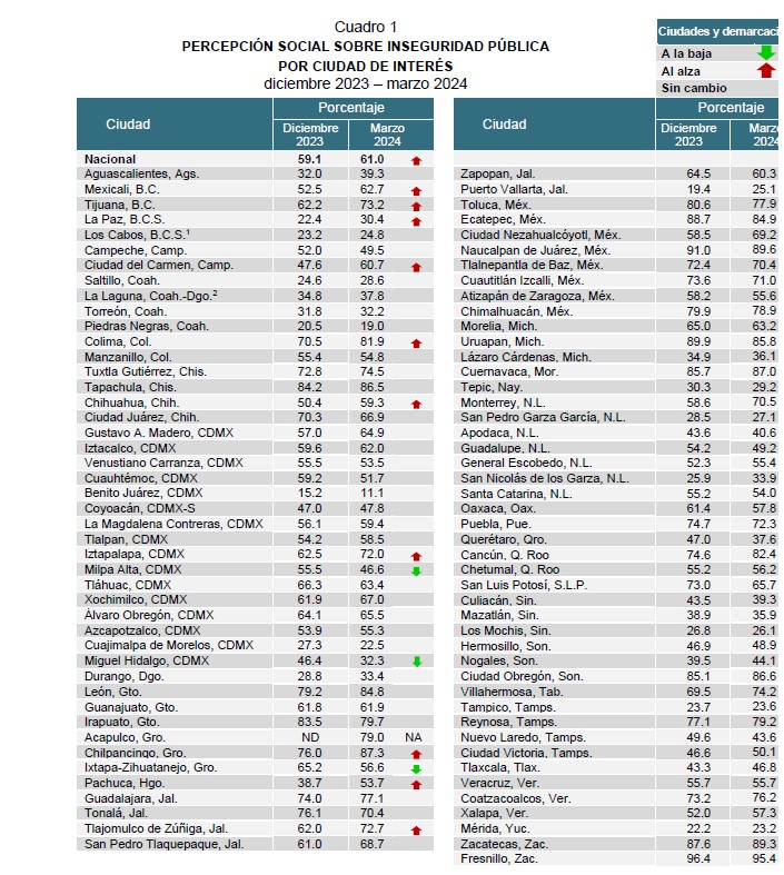 “En Benito Juárez la percepción de inseguridad pública mantiene su tendencia a la baja al pasar de 15.2% en diciembre de 2023 a 11.1% en marzo de este año. Es un dato histórico y demoledor. Sobre todo, al momento de comprarlo con Iztapalapa”.