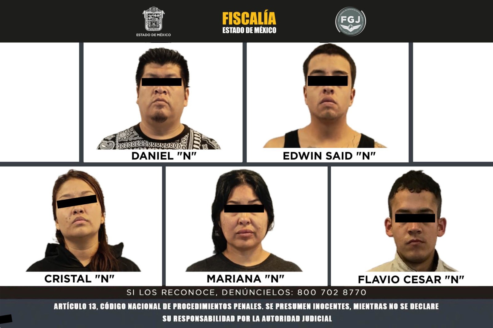 Una vez autorizado, dicho mandamiento judicial fue cumplimentado por elementos de la Policía de Investigación, quienes se trasladaron a un inmueble ubicado en la colonia Ojo de Agua, perteneciente al municipio de Tecámac, en donde rescataron al menor, víctima de secuestro, y detuvieron a tres masculinos identificados como Flavio César “N”, Edwin Said “N”, Daniel “N”, así como a Mariana “N” y Kristal “N”, como posibles partícipes en este hecho delictivo.