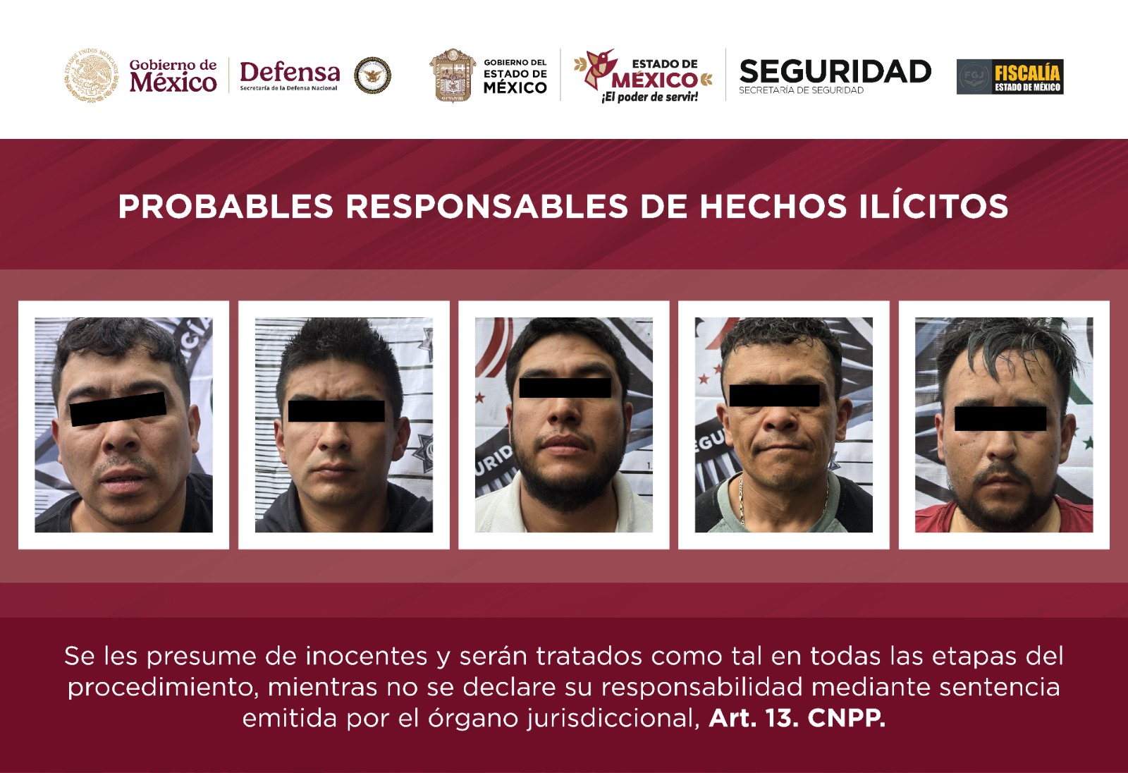 En una acción coordinada, la Secretaría de la Defensa Nacional (Defensa), Guardia Nacional (GN), Fiscalía General de Justicia del Estado de México y Secretaría de Seguridad estatal detuvieron a cinco hombres y a un menor de edad probables responsables de agredir a las fuerzas del orden.