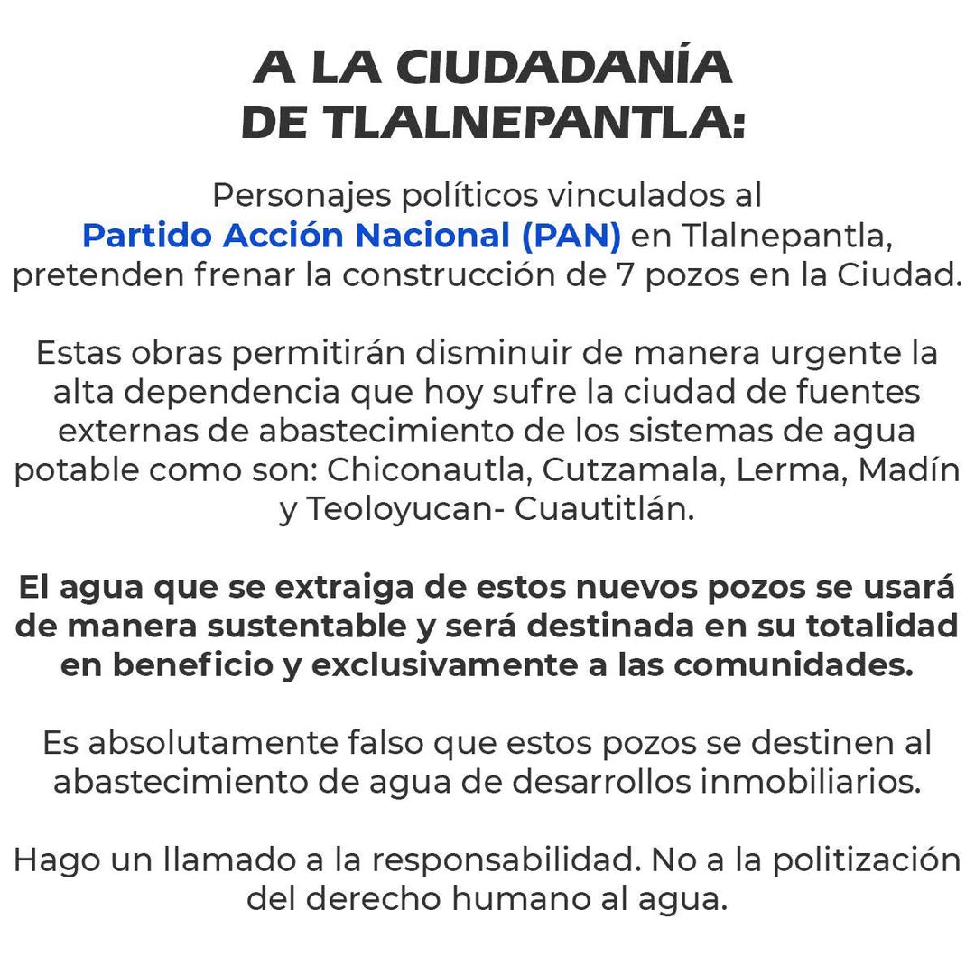 Por un lado, Raciel Pérez acusa que personajes vinculados al PAN en Tlalnepantla pretenden frenar la construcción de los pozos, mismos que permitiran disminuir de manera urgente “la alta dependencia que hoy sufre la ciudad de fuentes externas de abastastecimiento de los sistemas de agua otable como son: Choconautla, Cutzamala, Lerma, Madín, Teoloyuca-Cuautitlán”.
