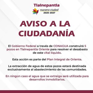 En torno al Plan Integral Oriente -suma de acciones federales, estatales y municipales en 15 municipios de la entidad-, la Comisión Nacional de Agua (Conagua) inició semana la construcción de cinco pozos cuya extracción de agua, se dice, estará destinada exclusivamente al abastecimiento de comunidades; “y en ningún caso el agua que se extraiga será destinada para desarrollo inmobiliarios”, afirmó el edil de Tlalnepantla, Raciel Pérez.