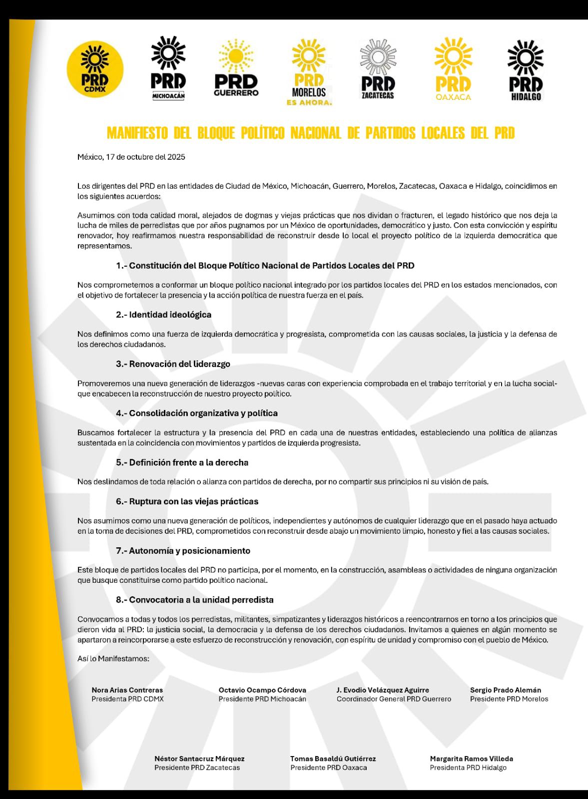 “Nos reivindicamos con nuestra historia en la izquierda. Asumimos con toda calidad moral el legado de miles de perredistas que lucharon por un México de oportunidades, democrático y justo. Con esa convicción reafirmamos nuestra responsabilidad de reconstruir desde lo local el proyecto político de la izquierda democrática”, establece el documento firmado por los liderazgos estatales.