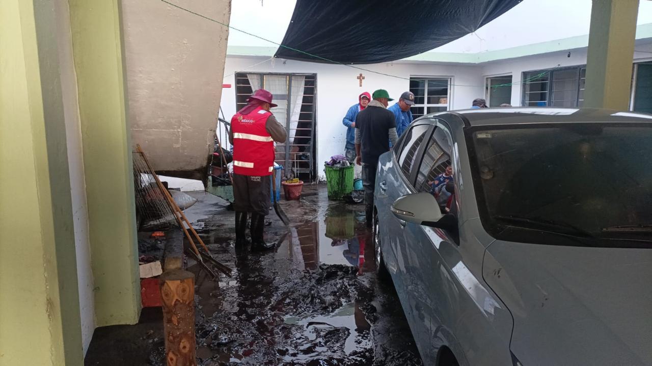 Personal del Grupo Tláloc realiza trabajos de desahogo y limpieza de las casas con apoyo de tres equipos de bombeo, un hidroneumático y herramientas menores; mientras que otro contingente está trabajando con un retroexcavadora y dos camiones de volteo para localizar la fractura en la tubería.